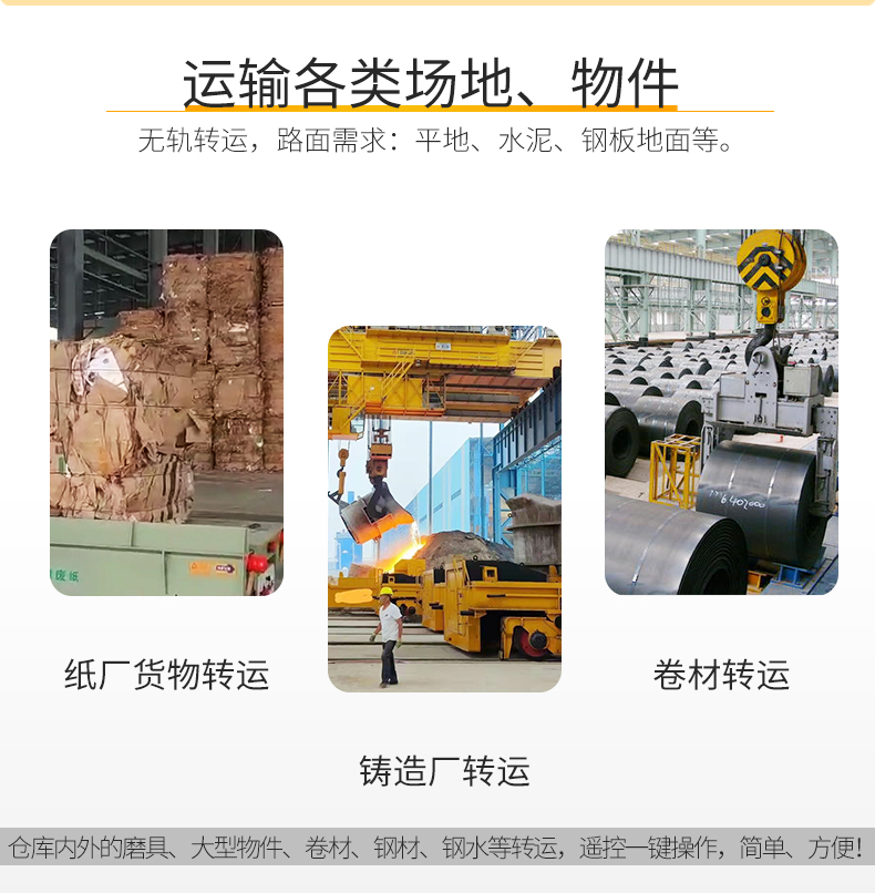 無軌電動平車不受軌道限制,可以在任何平坦的地面上自由移動,適應(yīng)不同的工作環(huán)境。